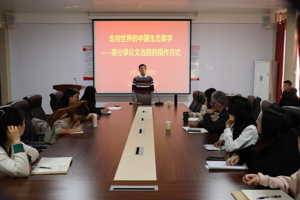本次讲座分两个阶段。第一阶段,周思钊博士以《走向世界的中国生态美学——兼分享论文的选题操作方式》为题,以其发表的核心期刊学术论文写作为实例,向大家分享了教师应如何在课程教学实践中发现问题、形成研究,并进行学术创作。周博士的讲座内容涵盖了外语教科研论题的选择、论题写作的基础框架与技巧、论文质量提升路径以及案例分析等多个方面,为教师们提供了宝贵的经验和指导。