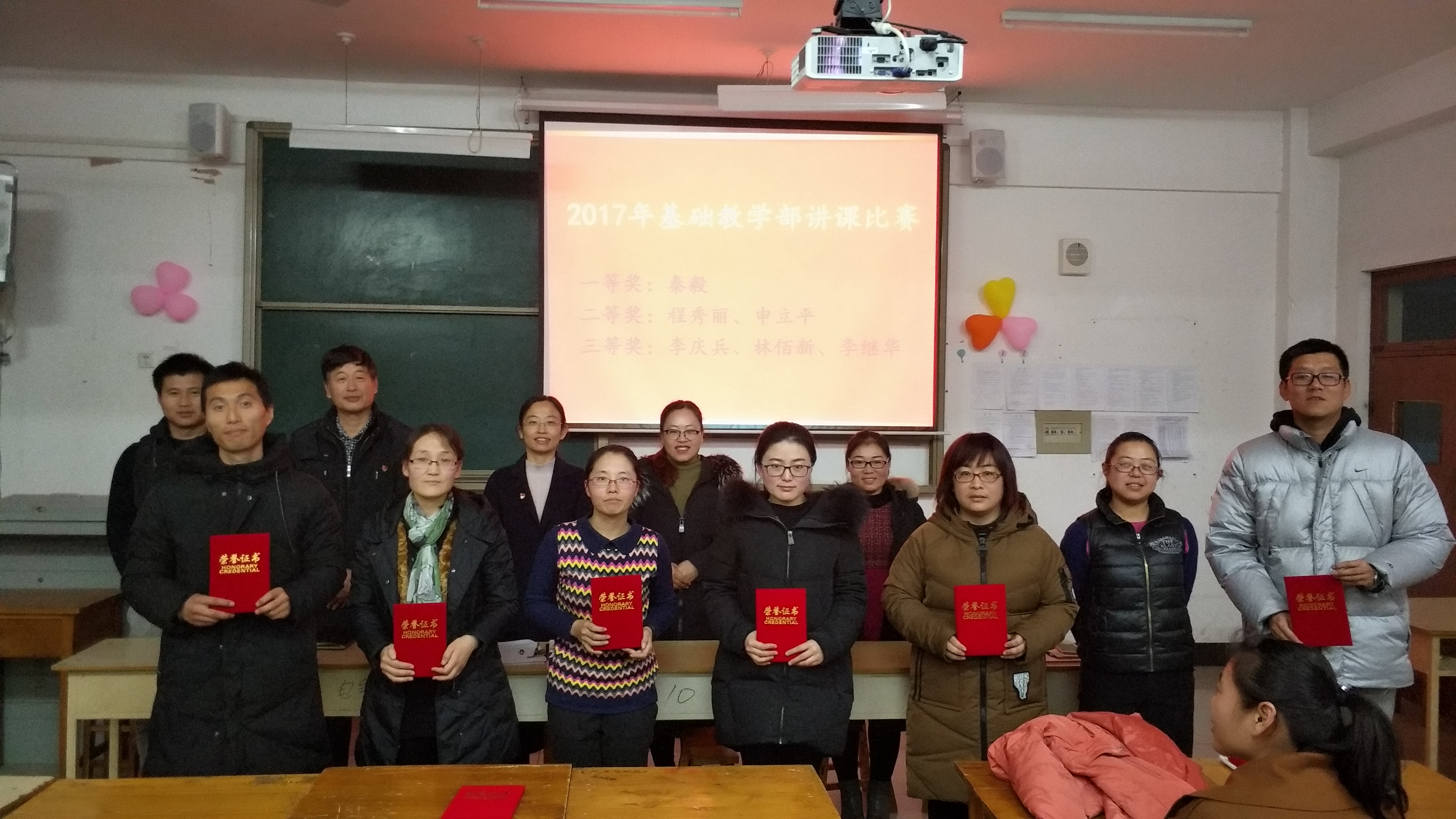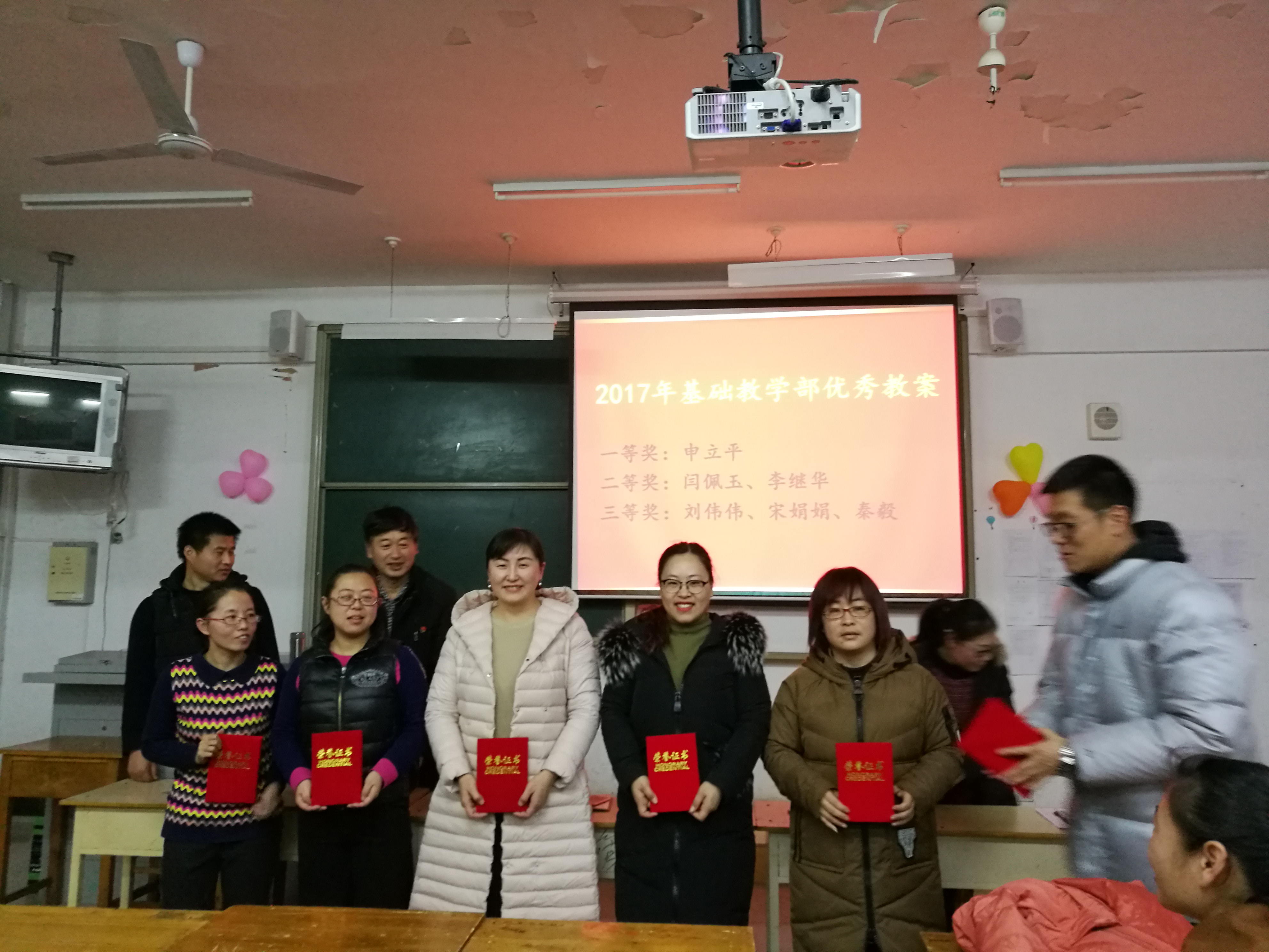 此次大会分为:课程改革经验交流、表彰先进、工作总结三个部分。课程改革经验交流主要为高职《大学英语》、高职《高等数学》、本科《大学体育》和本科《概率论与数理统计》四门课改课程的阶段性成果汇报。林静老师、程秀丽老师、于寅生老师、吴延红老师分别对所负责课改课程进行了总结,四位老师带领其教学改革团队,按照我校推行课改课程的要求,积极进行课程模式和教学方法的改革。表彰先进主要对在本年度2017年基础教学部优秀教案、2017年基础教学部讲课比赛、2017年基础教学部说课比赛中取得优秀成绩的个人进行表彰。基础教学部副主任李琦、基础教学部副主任刘兖峰,以及英语、数学、体育、物理教研室主任共同为获奖的18名教师颁奖并合影留念。在场老师为获奖教师鼓掌祝贺,纷纷表示要向先进教师学习,鼓足干劲,奋起直追,不断提升教育教学能力。