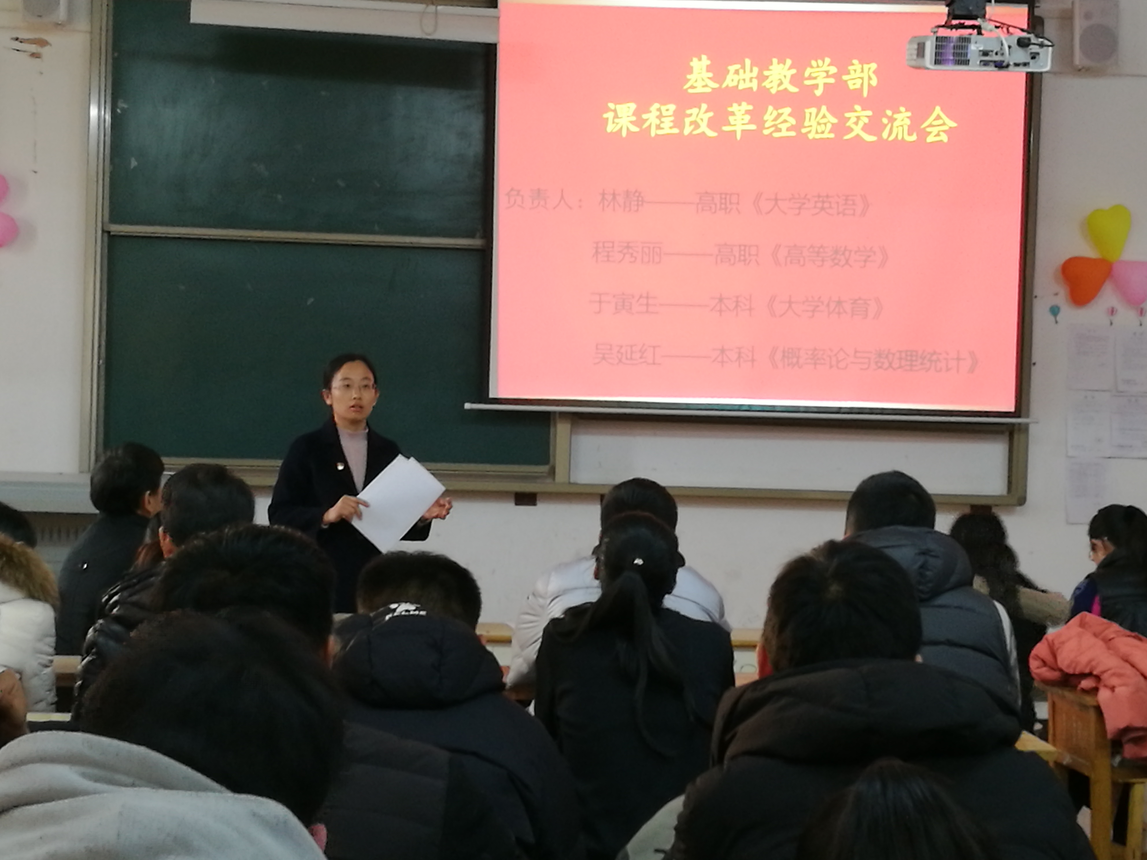 课程改革经验交流会主要为高职《大学英语》、高职《高等数学》、本科《大学体育》和本科《概率论与数理统计》四门课改课程的阶段性成果汇报。林静老师、程秀丽老师、于寅生老师、吴延红老师分别对所负责课改课程进行了总结,四位老师带领其教学改革团队,按照我校推行课改课程的要求,积极进行课程模式和教学方法的改革。英语教研室高职大学英语推行课前+课上+课后教学模式,精准分析,有效教学。高职《高等数学》布置完成了两次数学大作业,并根据学生答题情况记录作业成绩,进行量化赋分。本科《概率论与数理统计》任课教师根据学生完成的数学建模作业及调查报告对学生的最终成绩给出不同的等级。大学体育课改从体育必修课、体育选修课、阳光体育、体育俱乐部等四大方面入手,并结合我校实际情况进行探索性研究,制定一份详细的改革实施方案。