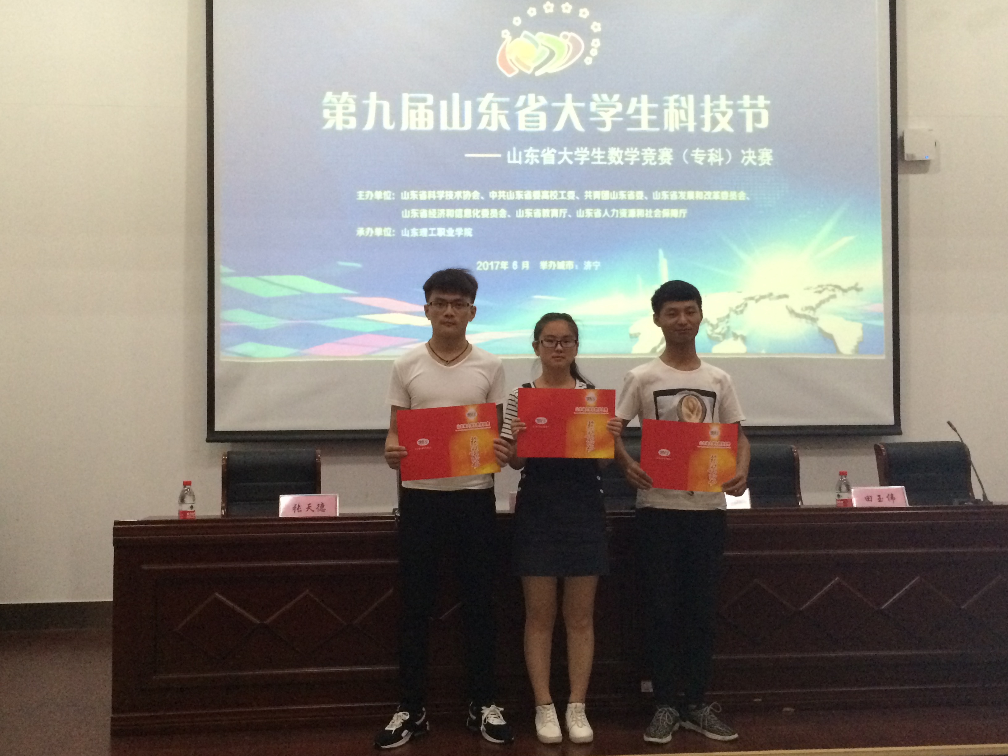 2017年6月3日,第八届山东省大学生数学竞赛(专科组)于山东理工职业学院举行落下帷幕。我校16级高职汽修2班马福钦同学荣获山东省一等奖,16级高职制冷3班王华云等2名同学荣获山东省二等奖,16级高职市销1班卜蕾等3名同学荣获山东省三等奖。