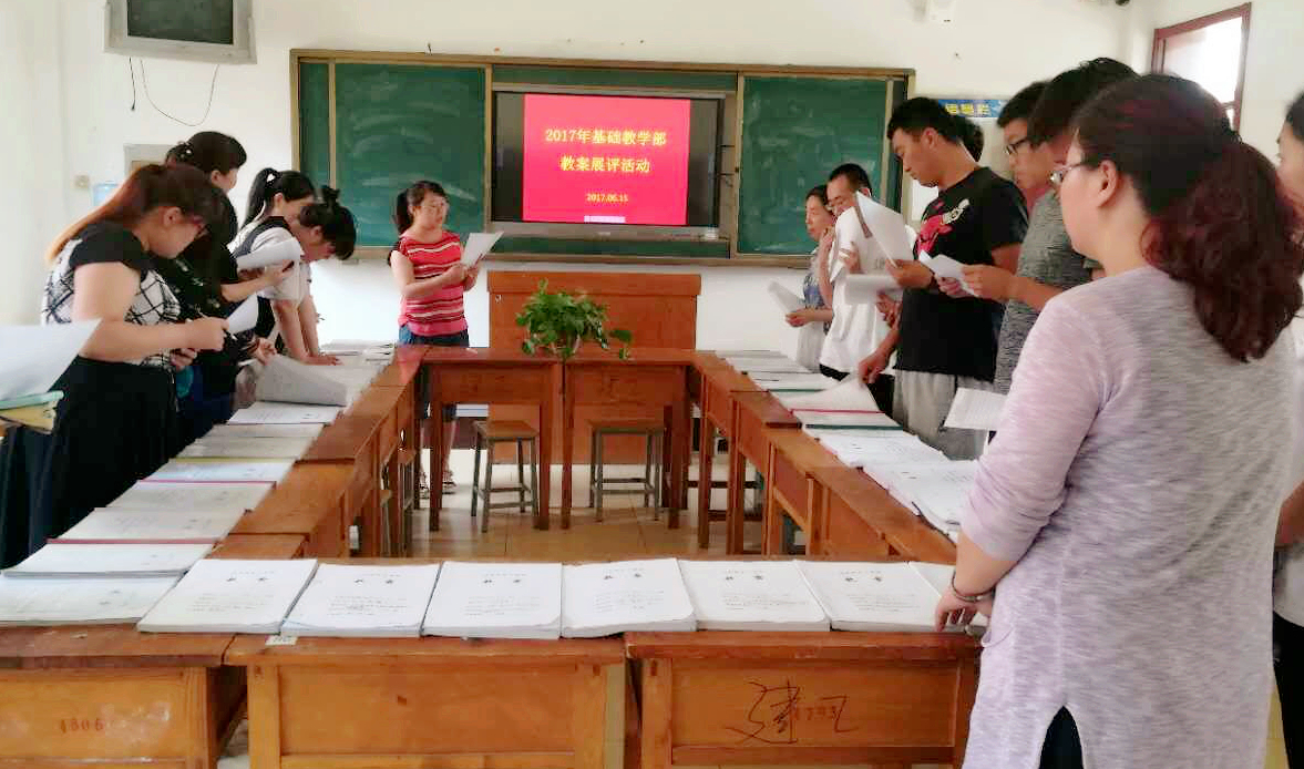 为进一步提高备课质量,加强教学常规管理,促进教师之间相互学习,根据学校“关于开展2017年优秀教案展评活动的通知”的要求,基础教学部于6月15日下午在5号楼105举行教案展评活动。活动由闫佩玉老师主持,评审组由数学教研室、英语教研室、体育教研室各推选的5名教师及物理教研室推选的2名教师共17人组成。