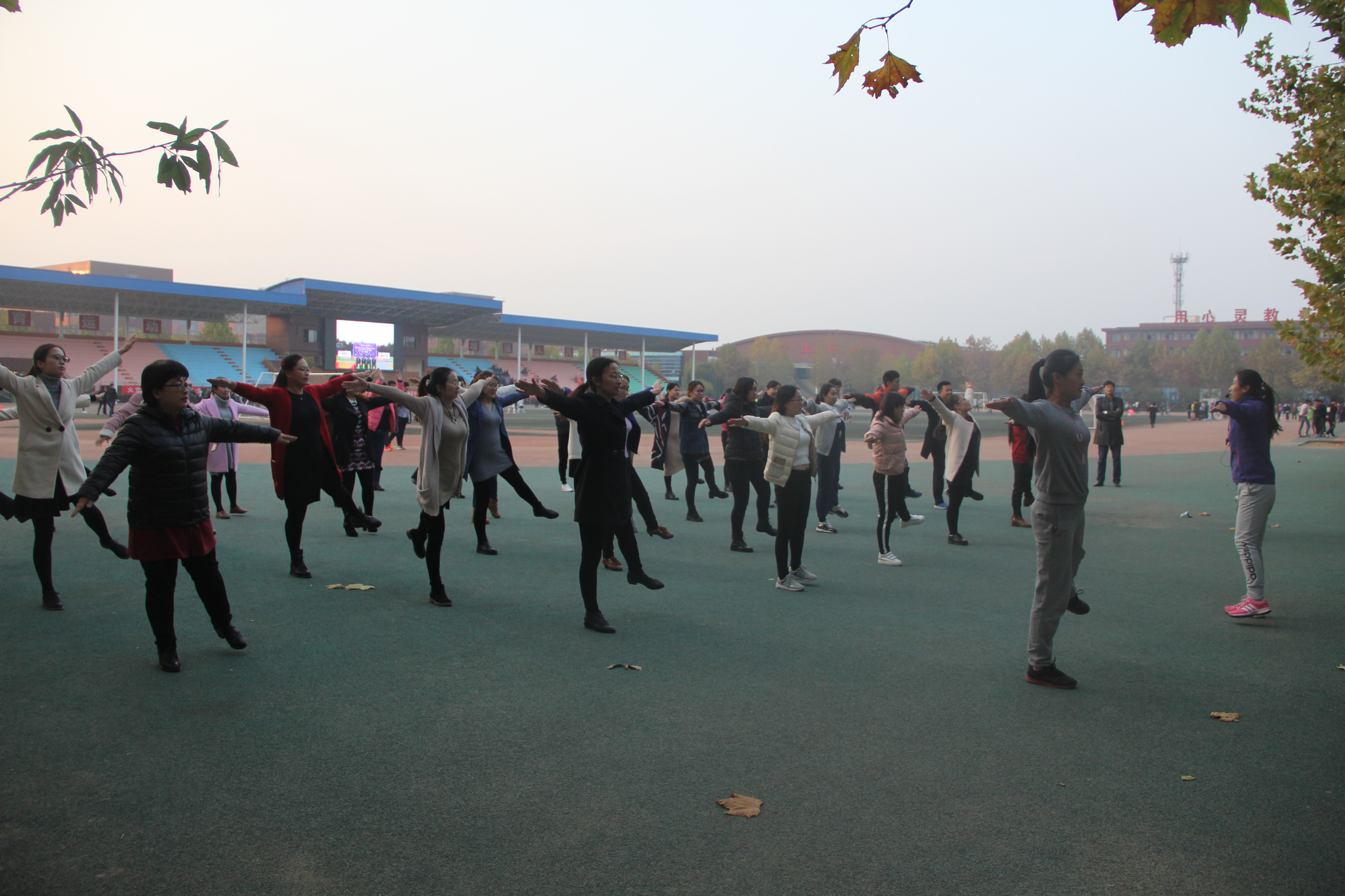 11月6日下午4:30分,操场上,微风习习,基础教学部全体教师在基础教学部副主任李琦的带领下,进行了第九套广播体操的训练。