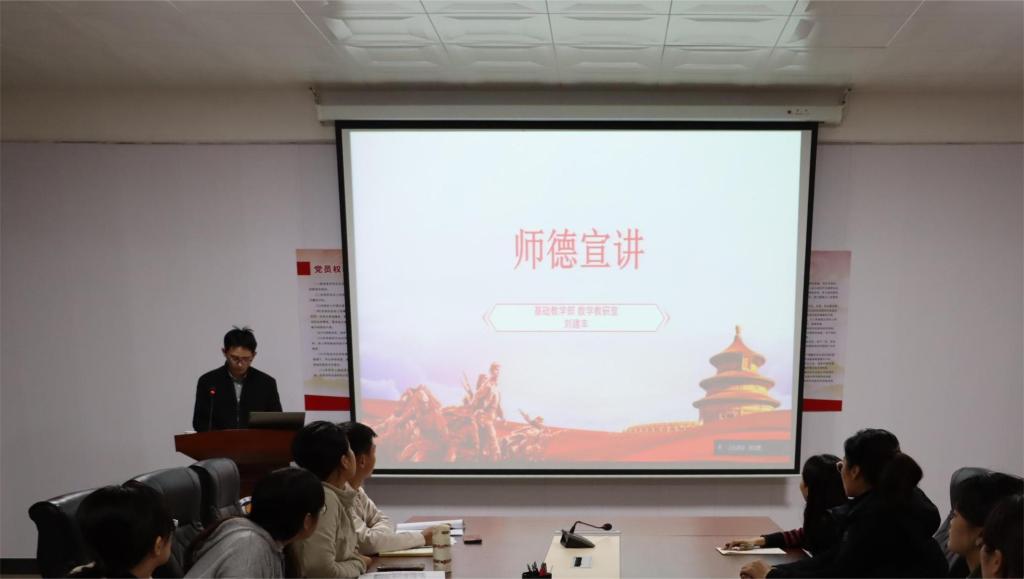 为深入学习贯彻党的二十大精神,强化师德师风宣传教育,弘扬高尚师德风范,根据《永利集团2023年“师德师风建设月”活动方案》文件要求,基础教学部于11月23日下午在10号二楼党员活动室开展“培根铸魂担使命立德树人建新功”师德宣讲活动,此次活动由来自外语教研室实验中心主任李海军、教师孟雪菲,及数学教研室的教师刘建丰分别进行了宣讲活动。