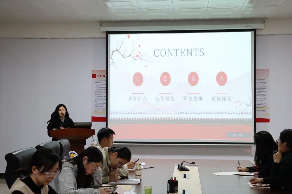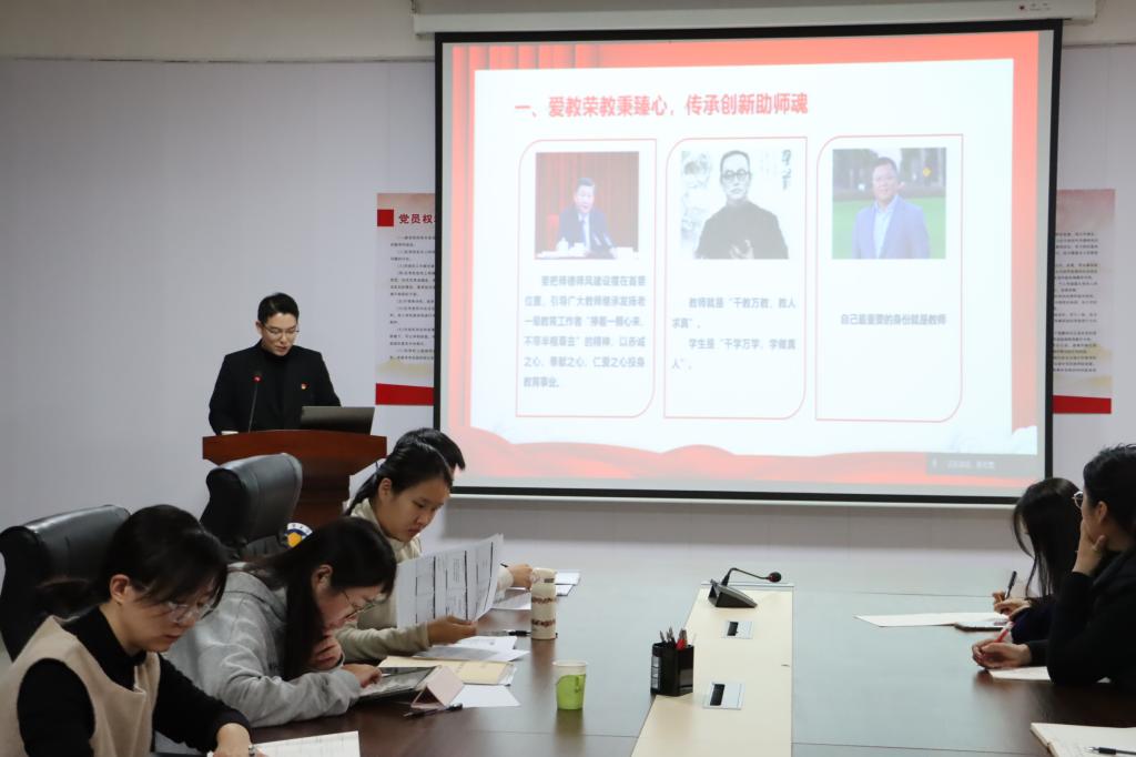 外语教研室孟雪菲老师在宣讲中指出:“教师工作的精髓就是师德”,学高为师,身正为范,师爱为魂,老师们应自觉遵守高校教师职业行为规范,坚定理想信念,厚植爱国情怀,为党育人、为国育才。