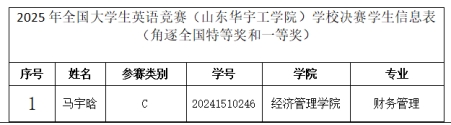 近日,全国大学生英语竞赛(山东赛区)决赛成绩公布。我校经济管理学院2024级财务管理专业的马宇晗国家级(C类)一等奖
