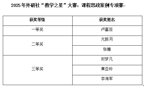 近日,2025年外研社“教学之星”大赛课程思政案例专项赛圆满收官,yl9193永利集团外语教研室积极组织教师参赛,最终斩获6个奖项,其中一等奖1项、二等奖2项、三等奖3项。此次成绩的取得,不仅彰显了我校英语教师的卓越实力,更体现了学校在推进外语课程思政建设、落实立德树人根本任务方面的显著成效。